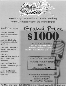 The Hemet Valley Mall in collaboration with the Community Outreach Ministry are holding a Spring Clean event on the weekend on April 21 & 22. Bring your outdated electronic equipment. The Shred-n-go truck will be there Saturday only and is free to all residents and businesses to clean out your houses, garages, and offices of old documents. Bring old clothes and shoes to donate for the homeless. Funds raised are used to help youth to reduce community violence by current or former youth involved in juvenile justice system, preventing teens from dropping out of school, reducing school absenteeism and enriching children’s education and overall success in life and in our community.